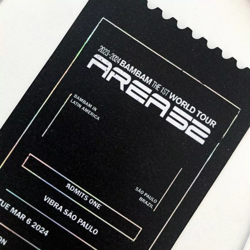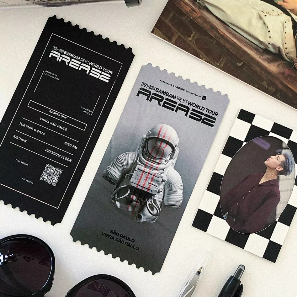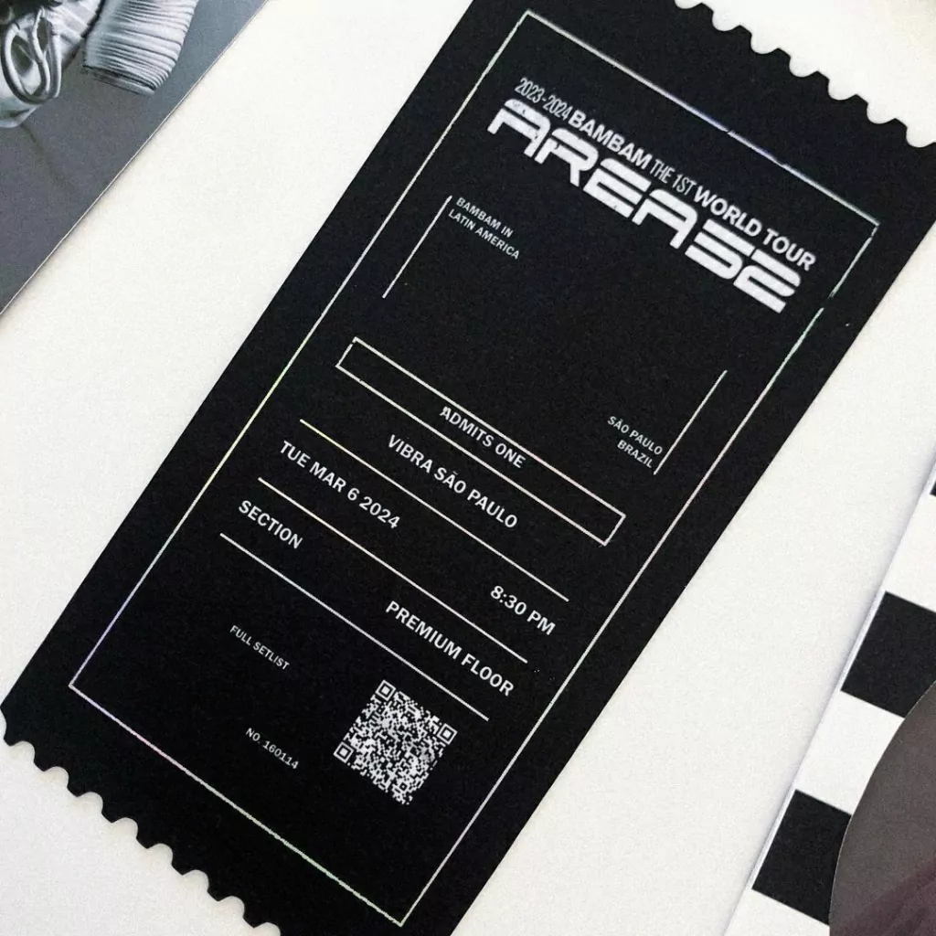 O Bilhete é um ingresso não-oficial de um show (podendo ser fictício ou real) dos grupos de KPOP, contando com o nome e lista de músicas da turnê, setor, fileira e assento fictícios do portador do ingresso, com alguns detalhes metálicos.