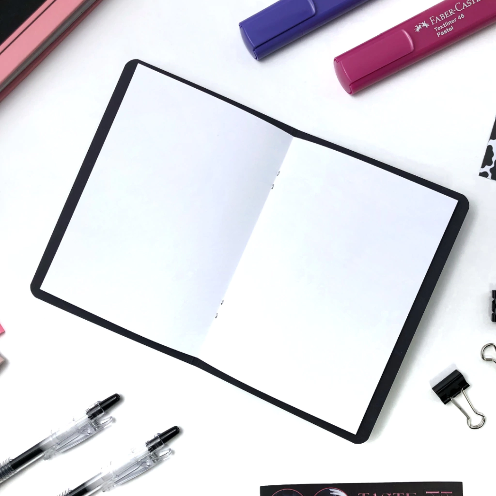 Os cadernos pocket são pequenos e leves, perfeitos para serem levados para qualquer lugar onde você precise. Em tamanho A6 (aproximadamente), eles contam com uma capa personalizada, 30 folhas brancas lisas e acabamento aveludado.