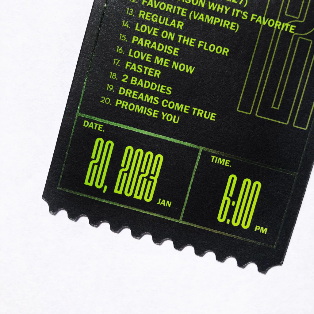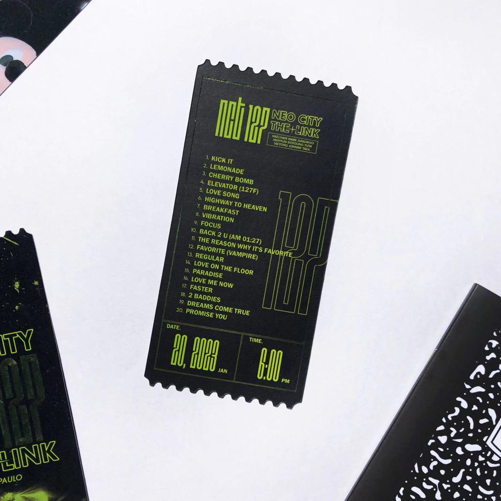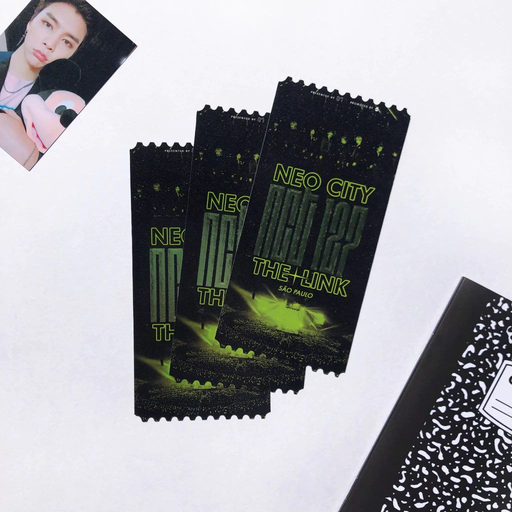 O Bilhete é um ingresso não-oficial de um show (podendo ser fictício ou real) dos grupos de KPOP, contando com o nome e lista de músicas da turnê, setor, fileira e assento fictícios do portador do ingresso, com alguns detalhes metálicos.